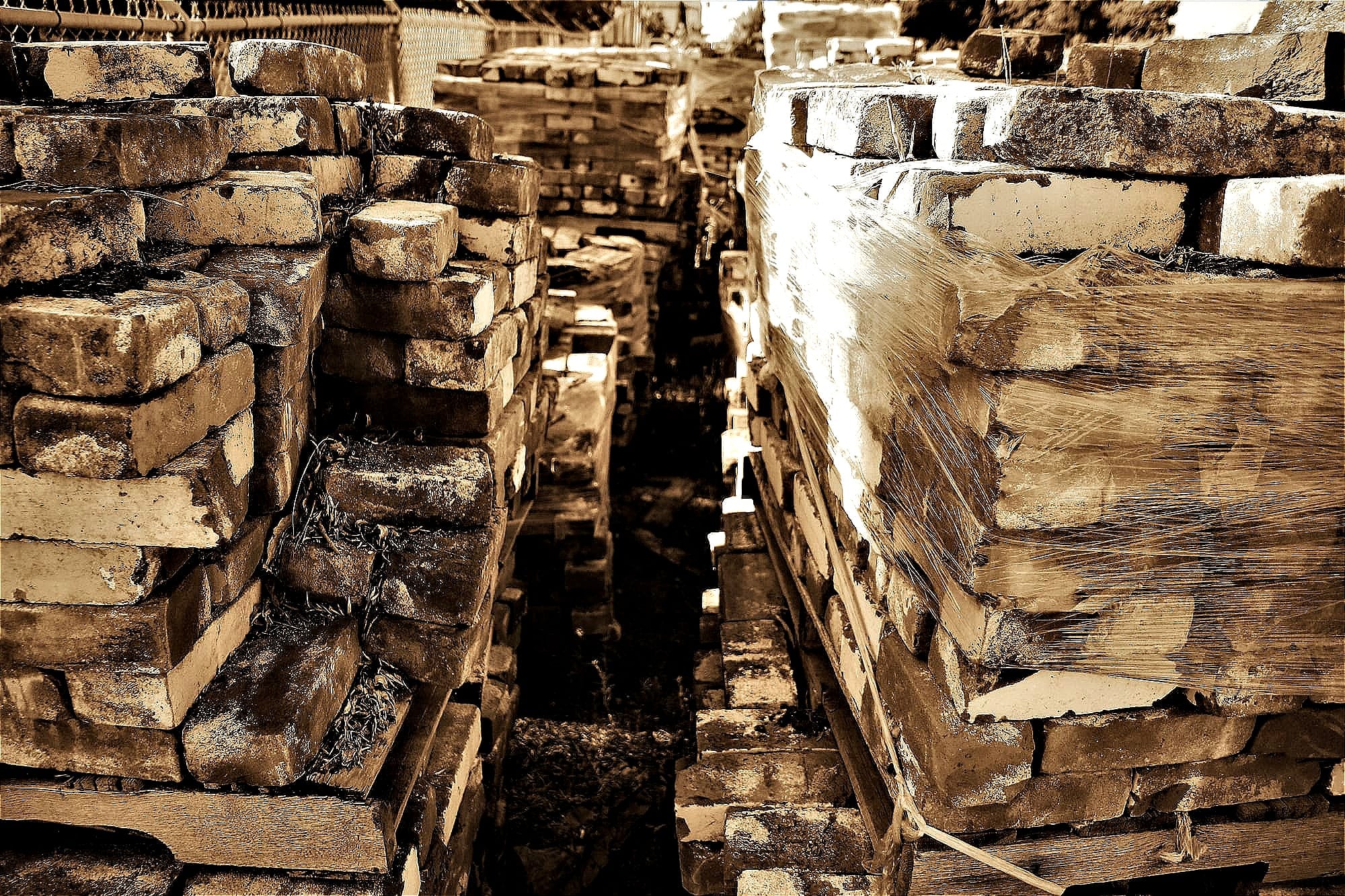 Like the great piles of river rock that languish not far away, the brick pallets had been dumped for future use or, perhaps, simply left to decay in the coming years. A service yard is also something of a graveyard for vehicles and tools which no longer serve a purpose, and a place of repose for surplus building materials. I focused on the pallet closest to me.