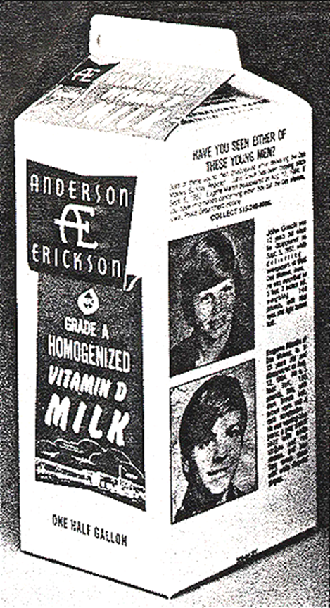 In September 1984, Anderson Erickson Dairy, local to Des Moines, Iowa, decided to use something they had right at their fingertips to push forward the mission. According to the Des Moines Register, the company decided to print two missing boys on the side of their milk cartons. For them, it was close to home, because the featured boys – Johnny Gosch and Eugene Martin – were local. Both boys had been abducted on their paper route: Martin less than a month earlier in August 1984, and Gosch in 1982.