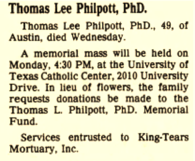 Thomas Lee Philpott–associate professor of history, fiery Catholic moralist and polemical leftist, and charismatic and much-honored teacher–ended his life on October 9, 1991, in Austin, Texas, after a yearlong illness. He was 49.