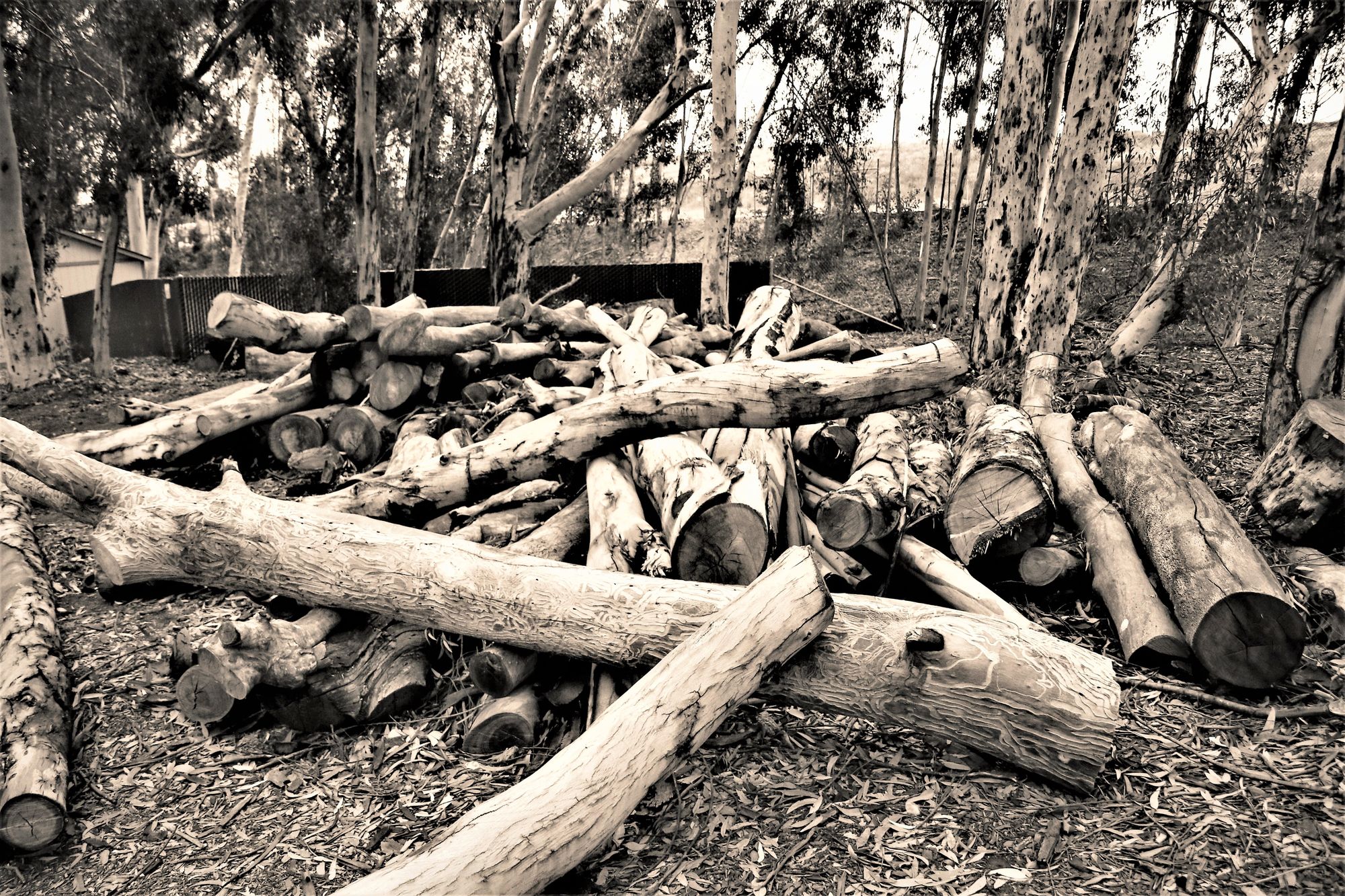 As the dog and I explored a forest road, these logs caught my attention. I was immediately reminded of Chollas Lake Park in San Diego, where I spent a portion of my park ranger career. In that location, I was constantly traversing fallen eucalyptus, evaluating the health of tree canopies, and reminding visitors that the towering limbs often fall without warning; the eucalyptus trees of the area were conveniently self-pruning.