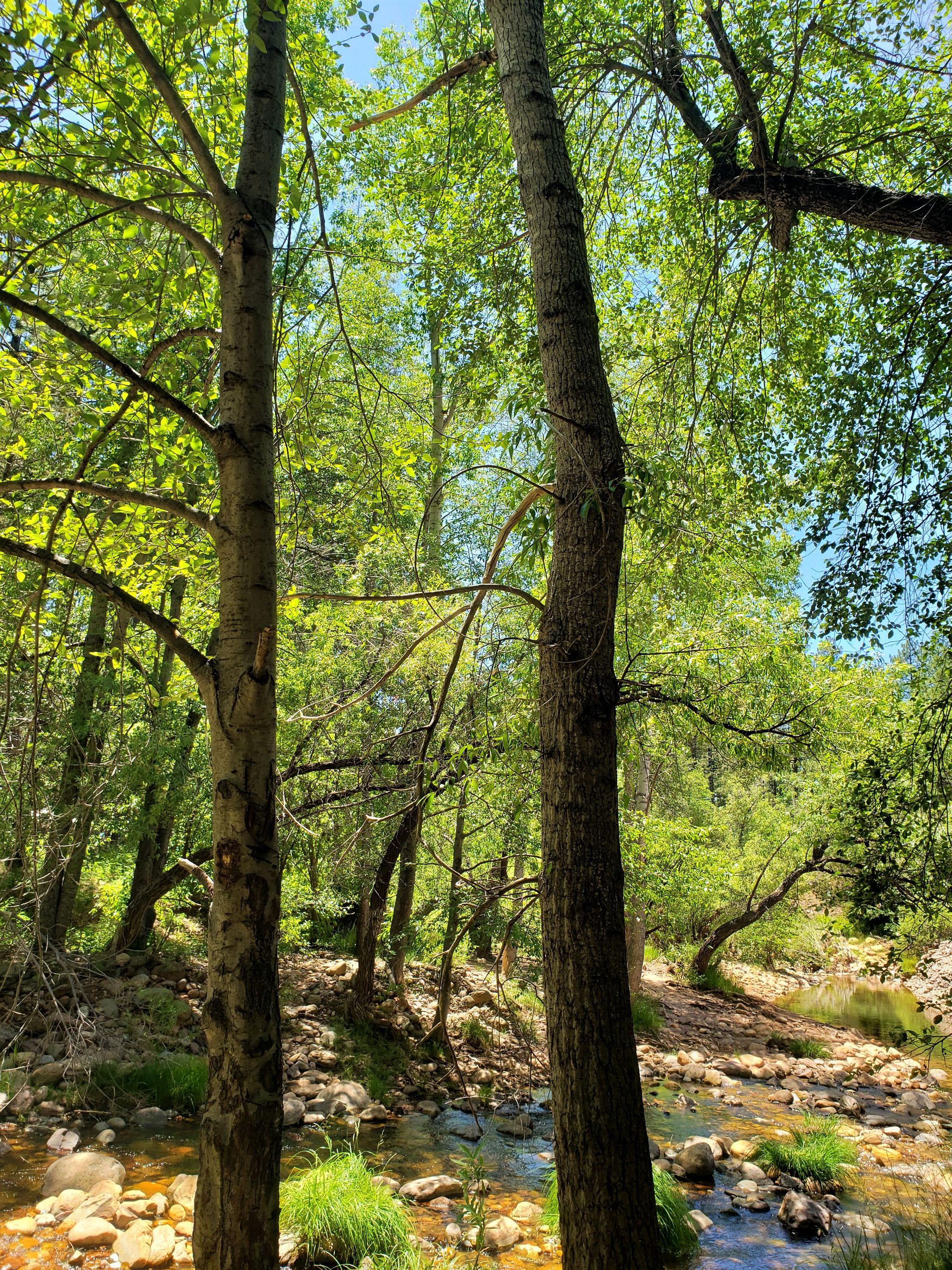 I was surprised to find so many cottonwoods when we arrived at the park, their leaves mingling with wind to create a distinctive ambience. The valley below Mogollon Rim is also quite beautiful. A liquid sound fills the air, and the tree canopies seem alive in the breeze, not in a vegetative sense but akin to animal existence, undulating high above us like some new form of life. The experience is memorable.