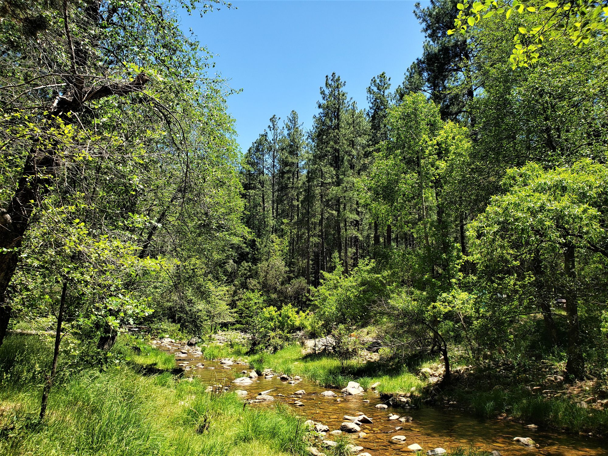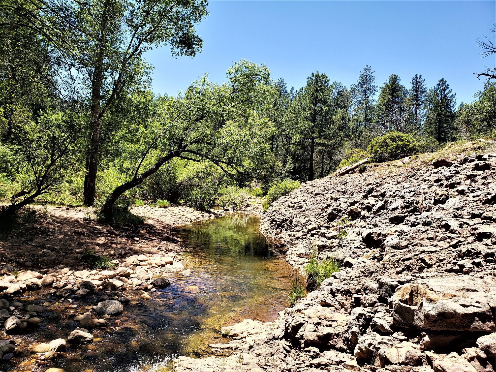 Realizing that we were outmatched, despite my dog's enthusiasm, I made polite conversation and quickly continued down the trail. The clear waters of the creek beckoned, and we carried on, making our way into the late morning. After that, we drove farther into the mountains, all the way to Mogollon Rim. This was my favorite adventure of the day.