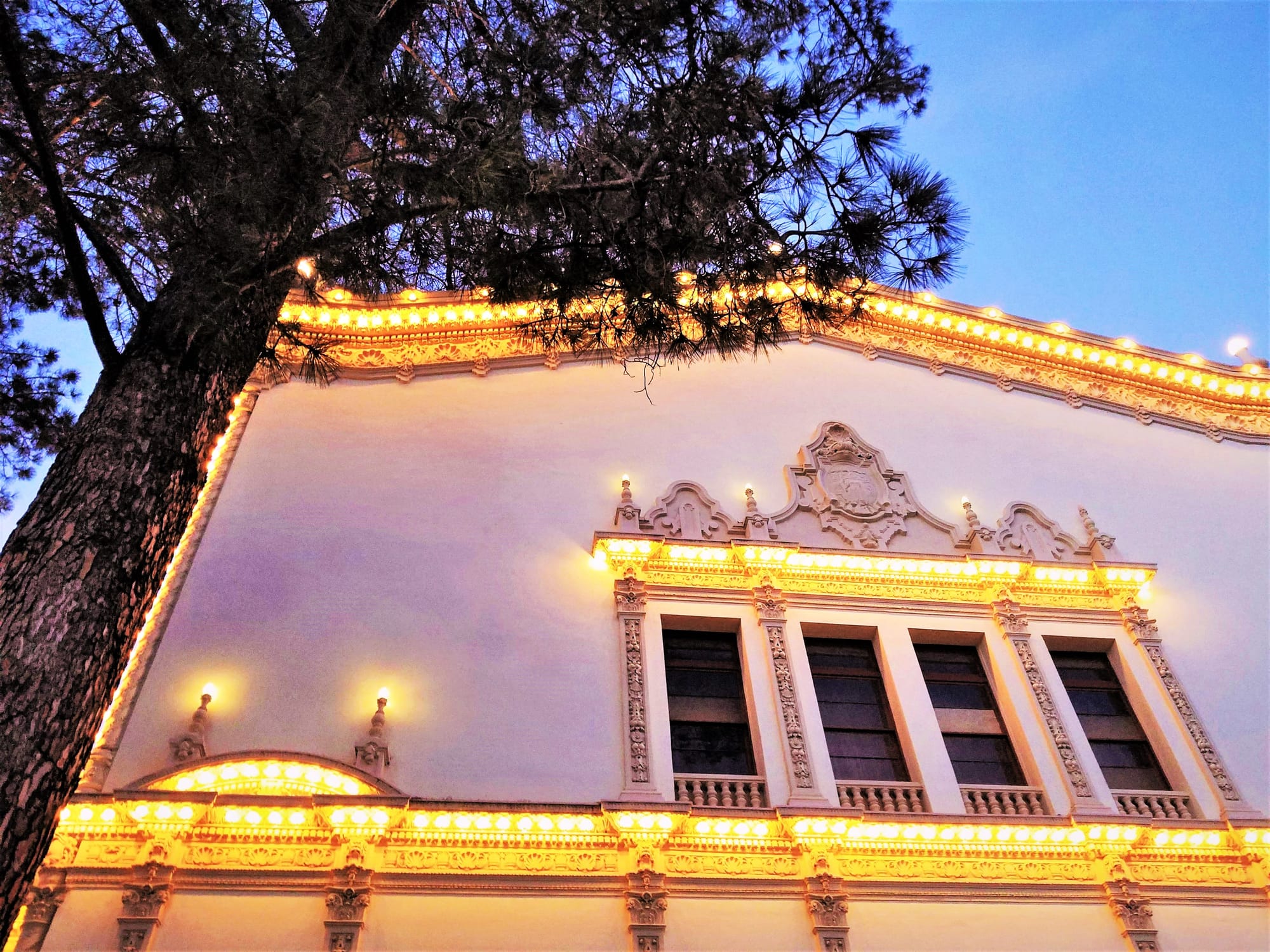 Writers, photographers, and painters all delight in the magnificence of dusk, those pastel interludes that evaporate into darkness. One evening at Balboa Park, I decided to photograph the architecture as night began to advance. The combination of artificial and natural light intrigued me, and the lines of a nearby tree felt poetic when I found the proper angle.