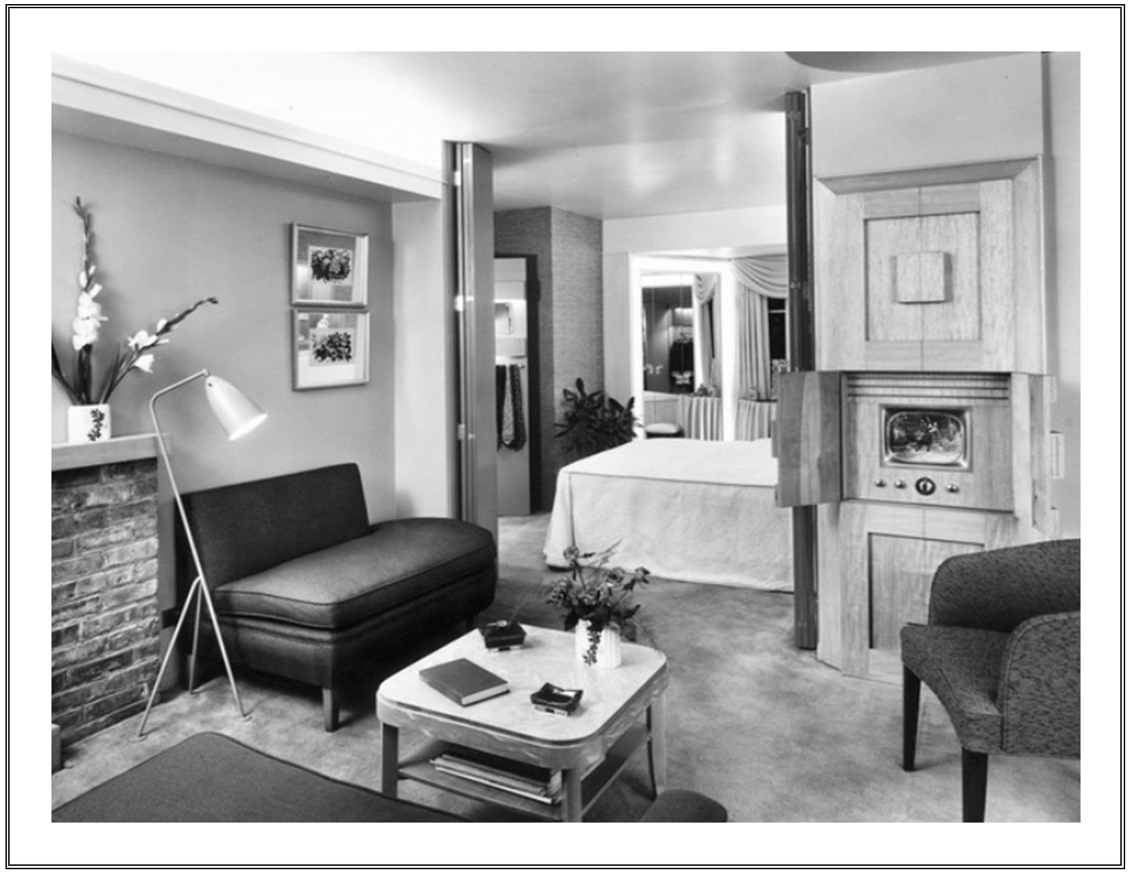 Televisions at midcentury were still a novelty, awkwardly placed amid more traditional furnishings. The scope of homelife in a prosperous nation was quickly being defined, from luxury and entertainment to functional elements. Thanks to progress, everything old could become new and sleek, taking on a refreshed aura. And this brings us to the subject of ambience and furnishings, thoughts on how we relate to our interiors.